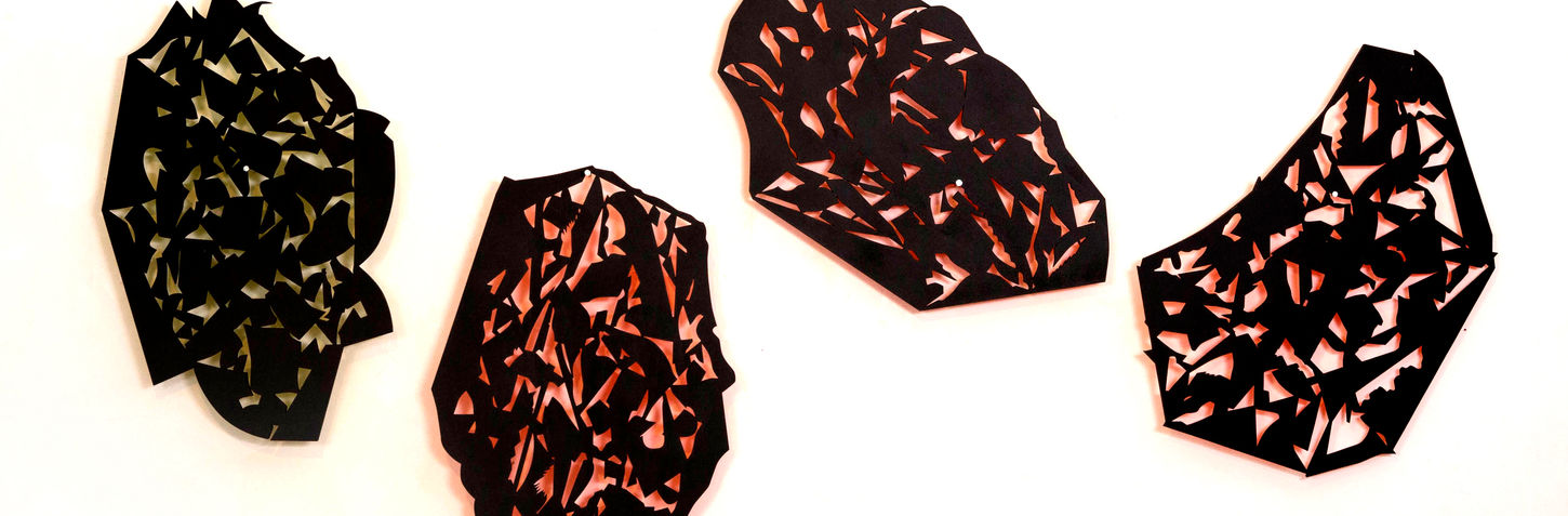 They say “geometry calms” because it helps us to understand and translate, to organize and balance the world. In my work, I venture an unsettling and contorted geometry. The “Involuntary Drawings” series emerges from close observation of urban landforms”: melted pavements, tangles of wires and plants, twisted irons, and other phenomena. These situations, with their grotesque mutant nature and manifestly fragile materials, feed the imaginary that underlies this series of “non-paintings”. Acrylic on paper cut with scalpel.